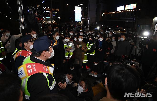[서울=뉴시스] 국회사진기자단 = 윤석열 국민의힘 대선 후보와 이준석 대표가 7일 저녁 서울 마포구 홍익지구대에서 지구대원들과 간담회를 마친 후 취재진 질문에 답변하고 있다. 2021.12.07. photo@newsis.com