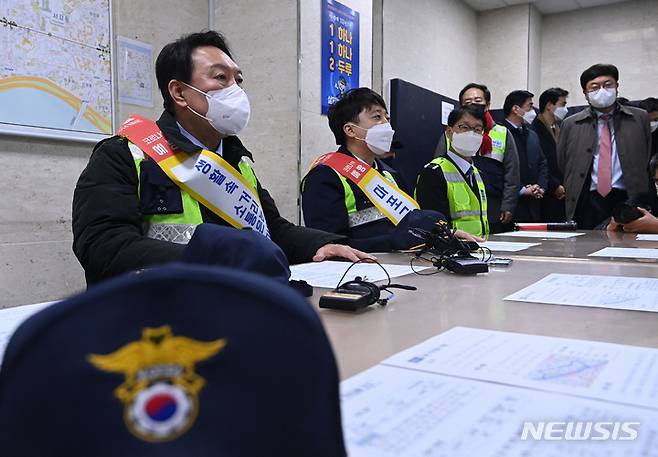 [서울=뉴시스] 국회사진기자단 = 윤석열 국민의힘 대선 후보와 이준석 대표가 7일 저녁 서울 마포구 홍익지구대에서 지구대원들과 간담회를 하고 있다. 2021.12.07. photo@newsis.com