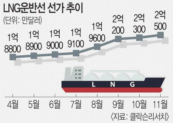 지난달에 선종별 선가를 보면 LNG선(17만4000㎥)이 2억500만 달러로 가장 높았다. 이어 컨테이너선(2만2000~2만4000TEU)이 1억8700만 달러, 초대형 유조선(VLCC)이 1억900만 달러 등이었다. LNG 운반선 가격은 한 달 사이 200만 달러(약 24억원)가 오르는 등 두드러진 상승세를 보였다. 국제해사기구(IMO)의 환경 규제가 본격화되면서 친환경 선박인 LNG선 수요가 늘었기 때문이다. 한국은 올해 들어 지난달까지 발주된 LNG선(592만CGT)의 91%를 가져왔다.
