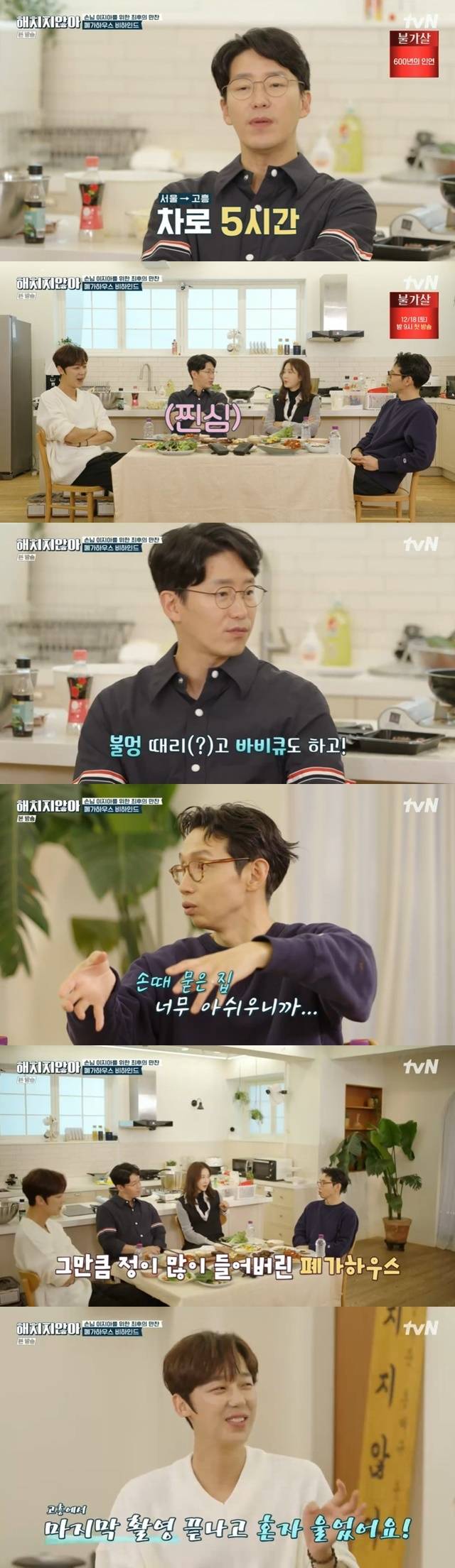 세 사람은 방송 후 주위 반응을 나눴고 윤종훈은 “재미있다는 반응이 제일 많다”며 “왜 카메라를 등지고 있느냐는 말이 많았다”고 말했다. 봉태규는 “엄마는 먼저 찍어놓고 나가는 걸 모르니까 항상 연락이 온다. 삼겹살을 그렇게 구우면 안 된다고. 똑같이 말한다. 이미 다 찍었다고”라며 모친의 반응과 함께 앞서 폐가하우스에서 질긴 삼겹살을 구운 흑역사를 언급했다.