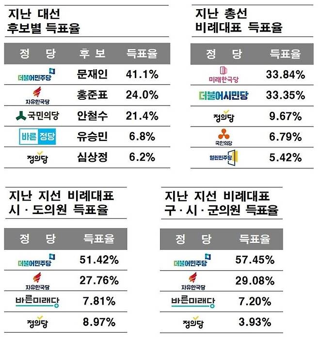 다음으로 지난 대선, 총선, 지선에서 3% 이상 득표율을 받은 정당들입니다.