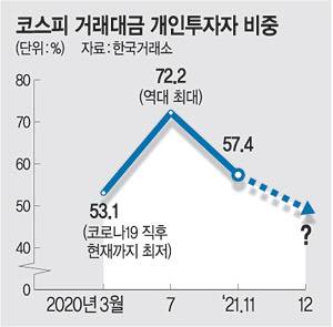이같은 흐름은 특히 개미군단의 이탈이 가속화되는 가운데 이뤄지고 있어 외국인의 시장 장악력 상승으로 이어지고 있다. 코스피 거래대금에서 개인이 차지하는 비중은 지난달 57.4%로, 코로나19 초창기 당시 팬데믹 선언으로 증시가 급락했던 지난해 3월(53.1%) 이후 가장 낮았다. 이달 들어선 50% 아래로 떨어질 것이란 분석이 나온다. 지난해 7월 개인의 코스피 매매 비중이 72.2%까지 치솟았던 상황과 비교하면 그야말로 투자자 동향이 뒤집힌 셈이다.