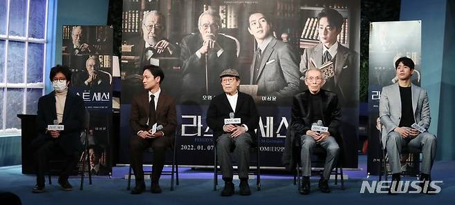 [서울=뉴시스] 박진희 기자 = 연극 '라스트 세션' 연출 오경택(왼쪽부터), 배우 전박찬, 신구, 오영수, 이상윤이 8일 서울 종로구 예스24스테이지에서 기자간담회를 하고 있다. 연극 '라스트 세션'은 미국의 극작가 마크 세인트 저메인이 아맨드 M. 니콜라이의 저서 '루이스 vs. 프로이트(THE QUESTION OF GOD)'에서 영감을 얻어 쓴 작품으로 지그문트 프로이트와 C.S. 루이스가 직접 만나 논쟁을 벌인다는 상상에 기반한 2인극이다. 2021.12.08. pak7130@newsis.com