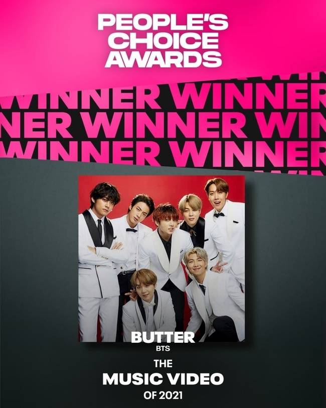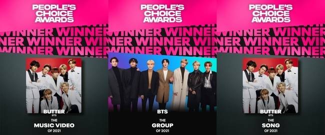 '2021 피플스 초이스 어워즈'에서 콜드플레이(Coldplay), 댄 앤 셰이(Dan + Shay), 조나스 브라더스(Jonas Brothers), 마룬5(Maroon 5) 등 쟁쟁한 후보들을 제치고 '올해의 그룹'에 오른 방탄소년단은 지난 5월 발매한 디지털 싱글 'Butter'로 '올해의 노래'와 '올해의 뮤직비디오' 트로피까지 거머쥐었다.