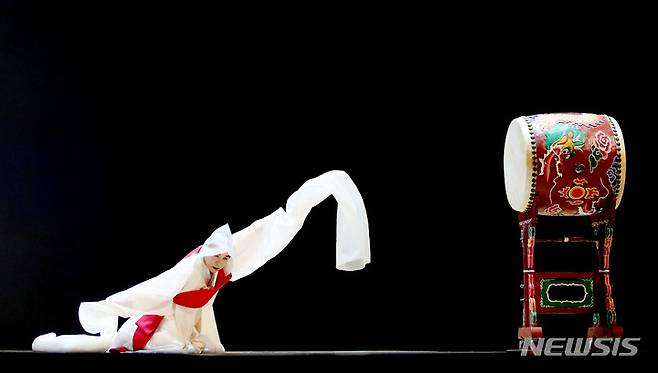 [서울=뉴시스] 김병문 기자 = 8일 오후 서울 종로구 세종문화회관에서 크라운해태제과 주최로 열린 국악공연 '제16회 창신제' 리허설에서 채상묵 명인이 승무 공연을 선보이고 있다. 2021.12.08. dadazon@newsis.com