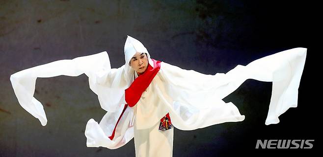 [서울=뉴시스] 김병문 기자 = 8일 오후 서울 종로구 세종문화회관에서 크라운해태제과 주최로 열린 국악공연 '제16회 창신제' 리허설에서 채상묵 명인이 승무 공연을 선보이고 있다. 2021.12.08. dadazon@newsis.com