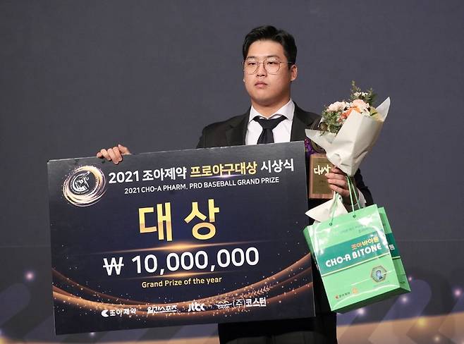 [서울=뉴시스] 8일 서울 중구 더플라자호텔 그랜드볼룸에서 열린 2021 조아제약 프로야구 대상 시상식에서 KT 강백호가 포즈를 취하고 있다. (사진=일간스포츠 제공) 2021.12.08. photo@newsis.com *재판매 및 DB 금지