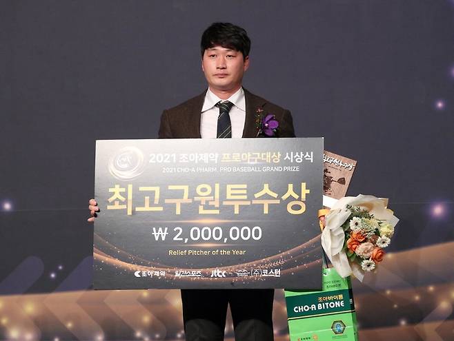 [서울=뉴시스] 8일 서울 중구 더플라자호텔 그랜드볼룸에서 열린 2021 조아제약 프로야구 대상 시상식에서 최고구원투수상을 수상한 삼성 오승환이 포즈를 취하고 있다. (사진=일간스포츠 제공) 2021.12.08. photo@newsis.com *재판매 및 DB 금지