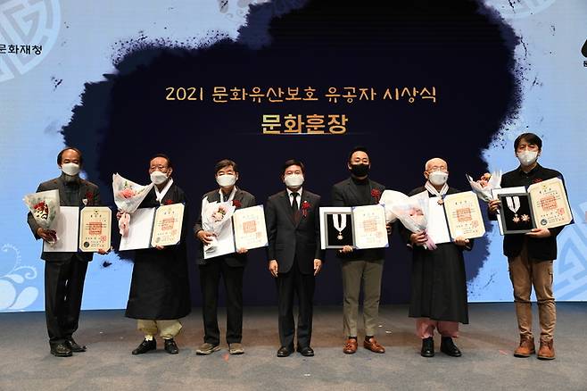 [서울=뉴시스] 백동현 기자 = 김현모(가운데) 문화재청장이 8일 오후 서울 강남구 민속극장 풍류에서 열린 2021 문화유산보호 유공자 포상 시상식에 참석해 수상자들과 기념촬영하고 있다. (사진=문화재청 제공) 2021.12.08. photo@newsis.com *재판매 및 DB 금지