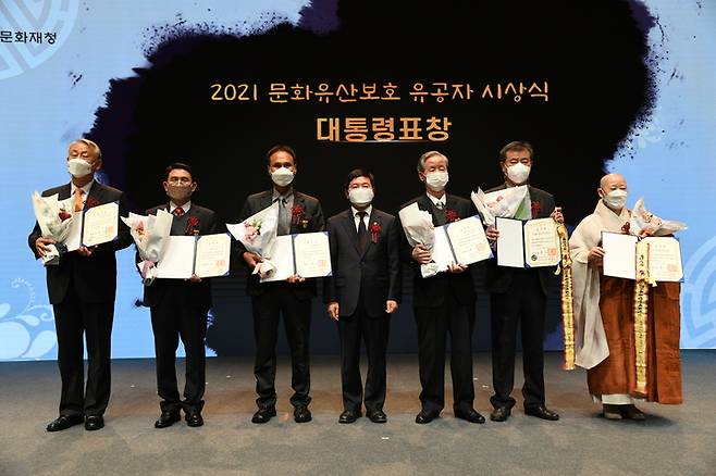 [서울=뉴시스] 백동현 기자 = 김현모(가운데) 문화재청장이 8일 오후 서울 강남구 민속극장 풍류에서 열린 2021 문화유산보호 유공자 포상 시상식에 참석해 수상자들과 기념촬영하고 있다. (사진=문화재청 제공) 2021.12.08. photo@newsis.com *재판매 및 DB 금지