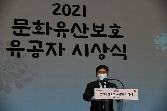 [서울=뉴시스] 백동현 기자 = 김현모 문화재청장이 8일 오후 서울 강남구 민속극장 풍류에서 열린 2021 문화유산보호 유공자 포상 시상식에 참석해 발언하고 있다. (사진=문화재청 제공) 2021.12.08. photo@newsis.com *재판매 및 DB 금지
