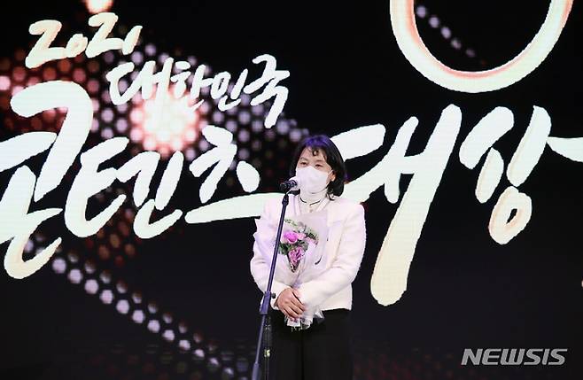 [서울=뉴시스] 조성우 기자 = 김수진 영화사 비단길 대표가 8일 오후 서울 강남구 코엑스에서 열린 2021 대한민국콘텐츠대상 시상식에서 보관문화훈장을 수훈한 뒤 소감을 말하고 있다. 2021.12.08. xconfind@newsis.com
