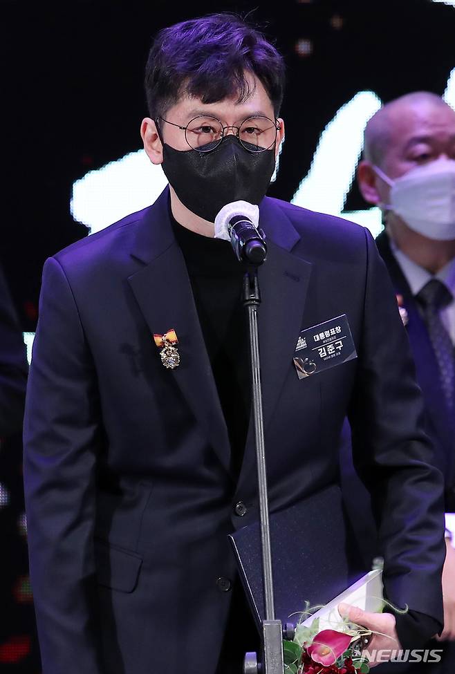 [서울=뉴시스] 조성우 기자 = 8일 오후 서울 강남구 코엑스에서 열린 2021 대한민국콘텐츠대상 시상식에서 해외진출유공 부문 대통령 표창을 받은 김준구 네이버웹툰 대표가 소감을 말하고 있다. 2021.12.08. xconfind@newsis.com