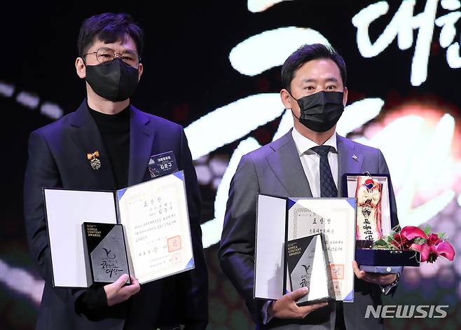 [서울=뉴시스] 조성우 기자 = 8일 오후 서울 강남구 코엑스에서 열린 2021 대한민국콘텐츠대상 시상식에서 해외진출유공 부문 대통령 표창을 받은 김준구 네이버웹툰 대표와, 강철구 스튜디오드래곤 대표가 기념촬영을 하고 있다. 2021.12.08. xconfind@newsis.com