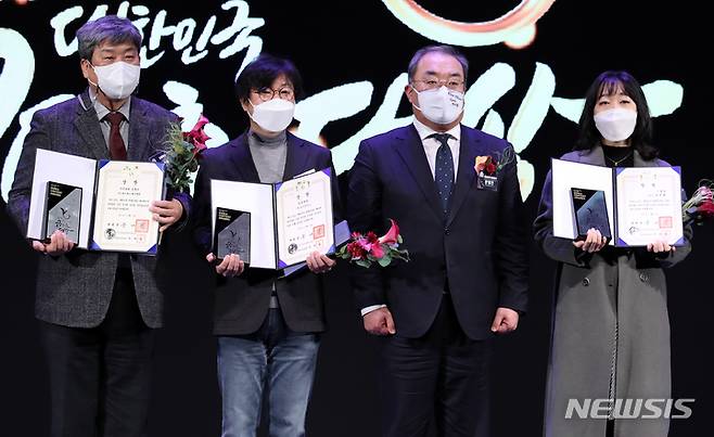[서울=뉴시스] 조성우 기자 = 8일 오후 서울 강남구 코엑스에서 열린 2021 대한민국콘텐츠대상 시상식에서 대통령 표창을 받은 수상자들이 기념촬영을 하고 있다. (왼쪽부터) 박기종 에스에스 애니멘트 대표, 최종일 아이코닉스 대표, 나윤희 만화가. 2021.12.08. xconfind@newsis.com