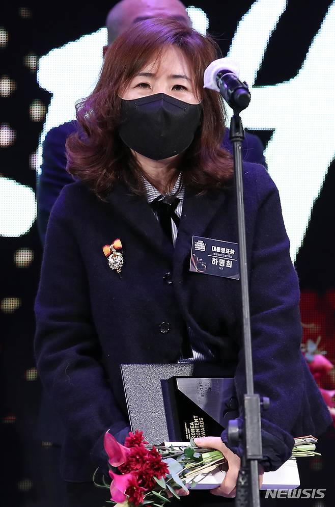 [서울=뉴시스] 조성우 기자 = 8일 오후 서울 강남구 코엑스에서 열린 2021 대한민국콘텐츠대상 시상식에서 방송영상산업발전유공 부문 대통령 표창을 받은 하명희 작가가 소감을 말하고 있다. 2021.12.08. xconfind@newsis.com
