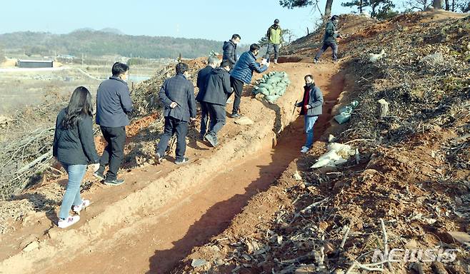 [나주=뉴시스] 류형근 기자 = 문화재청 관계자들이 8일 오후 전남 나주시 봉황면 '광주~강진 고속도로 5공구 건설 현장'에서 발견된 5~6세기 추정 장고분(長鼓墳) 유적에 대해 현장조사를 벌이고 있다. 2021.12.08. hgryu77@newsis.com