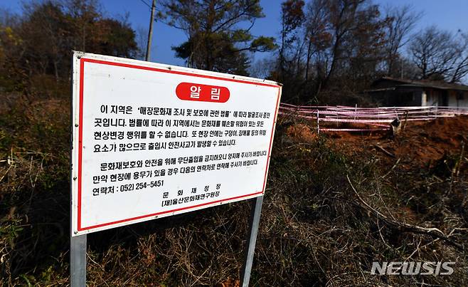 [나주=뉴시스] 류형근 기자 = 문화재청 관계자들이 8일 오후 전남 나주시 봉황면 '광주~강진 고속도로 5공구 건설 현장'에서 발견된 5~6세기 추정 장고분(長鼓墳) 유적에 대해 현장조사를 벌이고 있다. 2021.12.08. hgryu77@newsis.com