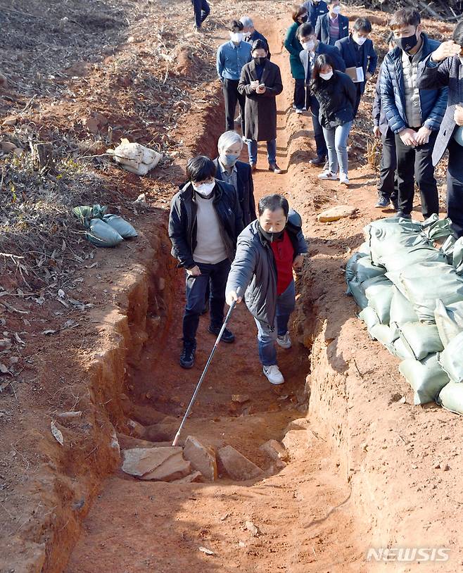 [나주=뉴시스] 류형근 기자 = 문화재청 관계자들이 8일 오후 전남 나주시 봉황면 '광주~강진 고속도로 5공구 건설 현장'에서 발견된 5~6세기 추정 장고분(長鼓墳) 유적에 대해 현장조사를 벌이고 있다. 2021.12.08. hgryu77@newsis.com