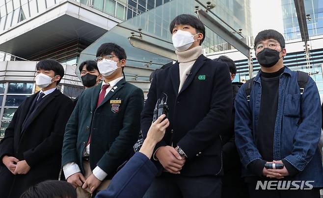 [서울=뉴시스] 권창회 기자 = 신동욱 양명고등학교 3학년 학생이 8일 오후 서울 서초구 서울행정법원에서 열린 2022학년도 대학수학능력시험 과학탐구영역 생명과학Ⅱ 출제오류 관련 집행정지 신청 심문을 마친 후 취재진 질문에 답변하고 있다. 2021.12.08. kch0523@newsis.com