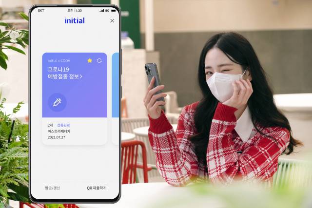 SK텔레콤 모델이 8일 각종 증명서를 발급·저장·제출할 수 있게 해주는 자사의 ‘이니셜’ 앱을 통한 코로나19 예방 접종 정보서비스 제공 소식을 알리고 있다. 앞으로 코로나19 백신을 접종 완료한 고객은 가입 통신사와 관계없이 이니셜 앱만 설치하면 예방 접종 정보 조회를 할 수 있다./사진 제공=SK텔레콤