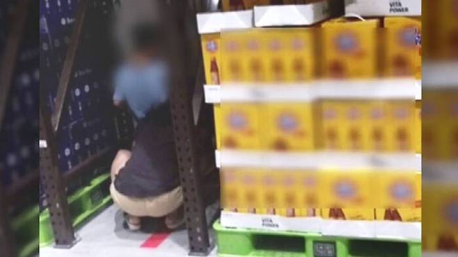 공개된 사진에는 음료 진열대 옆 방화 셔터가 내려오는 곳에서 소변을 보는 듯한 아이와 쪼그려 아이를 챙기는 여성의 모습을 담겨 있습니다.