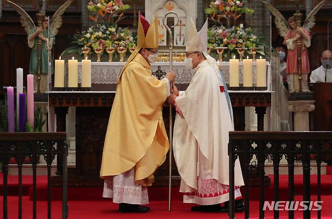 [서울=뉴시스] 사진공동취재단 = 염수경(오른쪽) 추기경이 8일 오후 서울 중구 명동대성당에서 천주교 서울대교구장에 취임하는 정순택 대주교에게 주교의 품위와 권할권을 상징하는 지팡이 목장을 전달하고 있다. 2021.12.08. photo@newsis.com