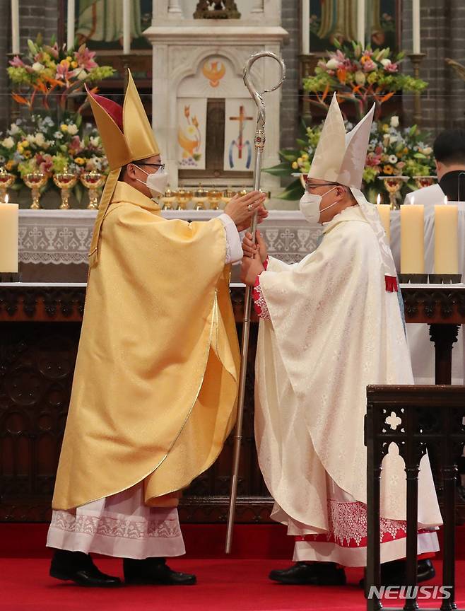 [서울=뉴시스] 사진공동취재단 = 염수경(오른쪽) 추기경이 8일 오후 서울 중구 명동대성당에서 천주교 서울대교구장에 취임하는 정순택 대주교에게 주교의 품위와 권할권을 상징하는 지팡이 목장을 전달하고 있다. 2021.12.08. photo@newsis.com