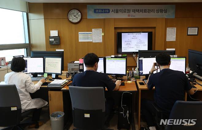 [서울=뉴시스] 고승민 기자 = 8일 서울의료원 재택치료관리 상황실에서 의료진이 재택 치료 중인 코로나19 확진자 모니터링 업무를 하고 있다. (공동취재사진) photo@newsis.com