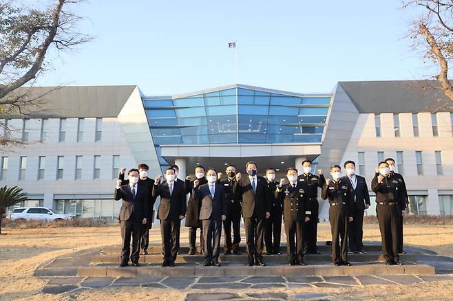 [서울=뉴시스] 백동현 기자 = 황기철 국가보훈처장이 8일 오후 제주 서귀포 해군 제7기동전단을 방문해 주요내빈과 함께 기념촬영하고 있다. (사진=보훈처 제공) 2021.12.08. photo@newsis.com *재판매 및 DB 금지