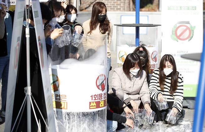 [광주=뉴시스] 변재훈 기자 = 대한민국 탄소 중립 비전 선언 1주년을 이틀 앞둔 8일 광주 북구청 광장에서 공직자들이 '일회용품 없는 생활' 실천 확산을 위한 퍼포먼스를 펼치고 있다. (사진=광주 북구 제공) 2021.12.08. photo@newsis.com *재판매 및 DB 금지
