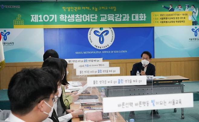[서울=뉴시스] 백동현 기자 = 조희연 서울시교육감이 8일 오후 서울 종로구 서울시교육청에서 서울학생인권조례 제정 10주년을 맞이해 제10기 서울학생참여단과 인권 토론을 하고 있다. (사진=서울시교육청 제공) 2021.12.08. photo@newsis.com *재판매 및 DB 금지