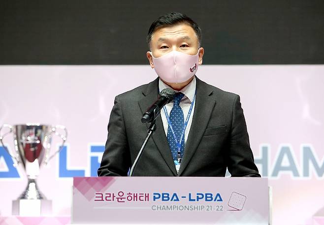 [서울=뉴시스] 백동현 기자 = 기종표 크라운해태 단장이 8일 경기 고양 빛마루 방송지원센터에서 열린 크라운해태 PBA-LPBA 챔피언십 대회 개막식에 참석해 발언하고 있다. (사진=PBA 투어 제공) 2021.12.08. photo@newsis.com *재판매 및 DB 금지