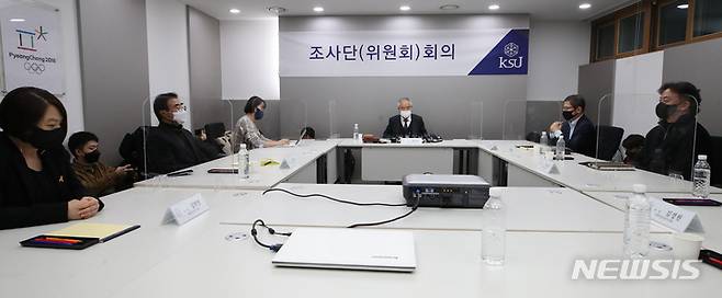 [서울=뉴시스] 조수정 기자 = 양부남 대한빙상경기연맹 조사위원장이 8일 오후 서울 송파구 방이동 대한빙상경기연맹 회의실에서 열린 2018 평창 동계올림픽 쇼트트랙 고의 충돌 의혹 관련 2차 조사단 회의를 마친 뒤 결과를 브리핑 하고 있다. 조사위는 심석희 선수가 손목 스냅으로 모 선수를 미는 것은 영상으로 확인했으나 고의 충돌 증거는 부족, 욕설 비하 등은 심 선수 본인이 인정했다고 밝혔다. 2021.12.08. chocrystal@newsis.com