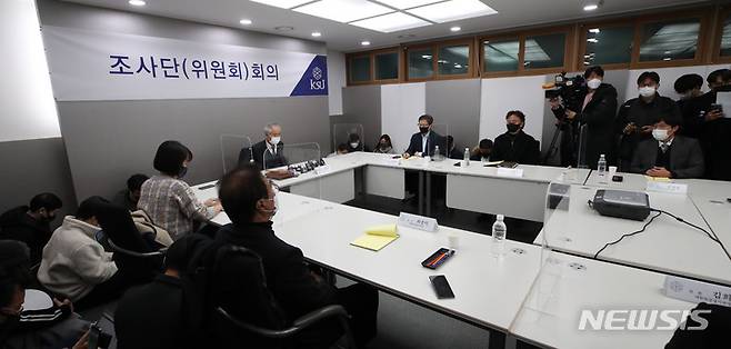 [서울=뉴시스] 조수정 기자 = 양부남 대한빙상경기연맹 조사위원장이 8일 오후 서울 송파구 방이동 대한빙상경기연맹 회의실에서 열린 2018 평창 동계올림픽 쇼트트랙 고의 충돌 의혹 관련 2차 조사단 회의를 마친 뒤 결과를 브리핑 하고 있다. 조사위는 심석희 선수가 손목 스냅으로 모 선수를 미는 것은 영상으로 확인했으나 고의 충돌 증거는 부족, 욕설 비하 등은 심 선수 본인이 인정했다고 밝혔다. 2021.12.08. chocrystal@newsis.com