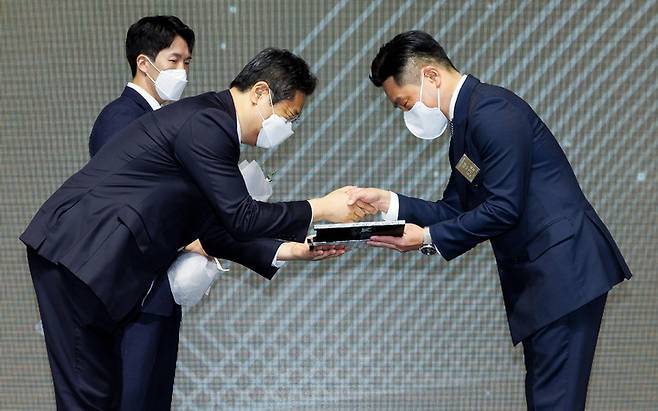 [서울=뉴시스] 백동현 기자 = 황희 문화체육관광부 장관이 8일 서울 강남구 임피리얼팰리스 호텔에서 열린 제2회 한국 스포츠메세나 시상식에서 대한장애인노르딕스키연맹 회장사 창성그룹 신기섭 대표이사에게 장관 표창을 수여하고 있다. (사진=문화체육관광부 제공) 2021.12.08. photo@newsis.com *재판매 및 DB 금지