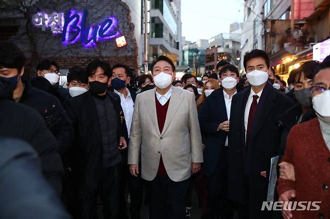 [서울=뉴시스] 국회사진기자단 = 국민의힘 윤석열 대선 후보가 8일 오후 서울 종로구 대학로 거리 플렛폼74에서 열린 청년문화예술인간담회를 마친 뒤 거리인사를 위해 이동하고 있다. 2021.12.08. photo@newsis.com