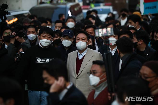 [서울=뉴시스] 국회사진기자단 = 국민의힘 윤석열 대선 후보가 8일 오후 서울 종로구 대학로 거리 플렛폼74에서 열린 청년문화예술인간담회를 마친 뒤 거리인사를 위해 이동하고 있다. 2021.12.08. photo@newsis.com