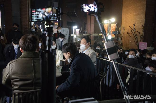 [서울=뉴시스] 국회사진기자단 = 윤석열 국민의힘 대선 후보와 이준석 대표가 8일 서울 종로구 대학로 거리에서 거리 인사 중 노천카페에서 청년예술인들과 차담회를 하고 있다. 2021.12.08. photo@newsis.com