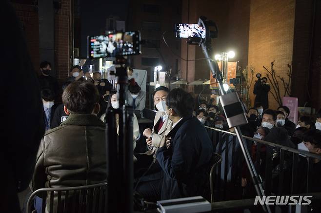 [서울=뉴시스] 국회사진기자단 = 윤석열 국민의힘 대선 후보와 이준석 대표가 8일 서울 종로구 대학로 거리에서 거리 인사 중 노천카페에서 청년예술인들과 차담회를 하고 있다. 2021.12.08. photo@newsis.com