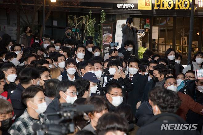 [서울=뉴시스] 국회사진기자단 = 윤석열 국민의힘 대선 후보와 이준석 대표가 8일 서울 종로구 대학로 거리에서 거리 인사하고 있다. 2021.12.08. photo@newsis.com