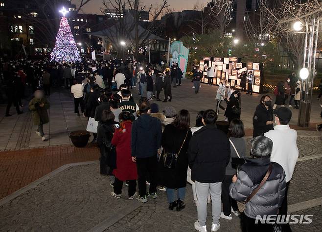 [서울=뉴시스] 국회사진기자단 = 8일 서울 종로구 마로니에공원서 시민들이 윤석열 국민의힘 대선 후보와 기념촬영을 위해 길게 줄지어 있다. 2021.12.08. photo@newsis.com