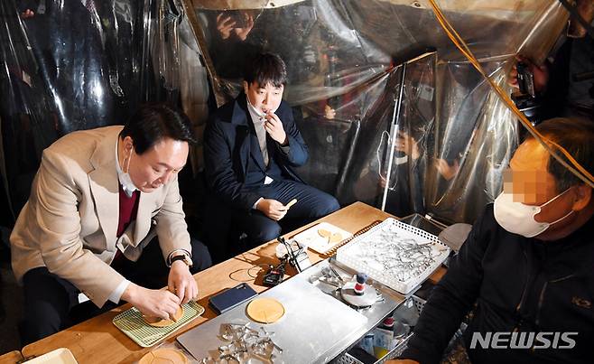 [서울=뉴시스] 국회사진기자단 = 윤석열 국민의힘 대선 후보와 이준석 대표가 8일 서울 종로구 대학로에서 거리인사 중 달고나 뽑기 체험을 하고 있다. 2021.12.08. photo@newsis.com