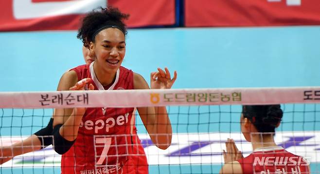 [광주=뉴시스] 류형근 기자 = 8일 오후 광주 서구 페퍼스타디움(염주종합체육관)에서 열린 2021~2022 V-리그 AI페퍼스 대 GS칼텍스의 경기, AI페퍼스 엘리자벳이 득점한 뒤 기뻐하고 있다. 2021.12.08. hgryu77@newsis.com
