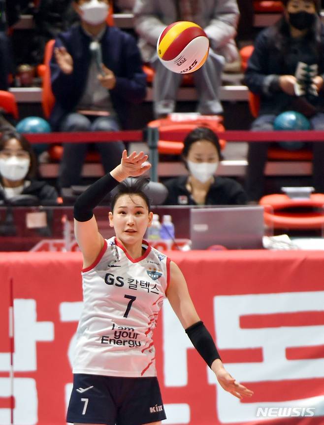 [광주=뉴시스] 류형근 기자 = 8일 오후 광주 서구 페퍼스타디움(염주종합체육관)에서 열린 2021~2022 V-리그 AI페퍼스 대 GS칼텍스의 경기, GS칼텍스 안혜진이 서브를 시도 하고 있다. 2021.12.08. hgryu77@newsis.com