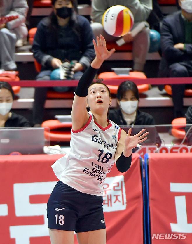 [광주=뉴시스] 류형근 기자 = 8일 오후 광주 서구 페퍼스타디움(염주종합체육관)에서 열린 2021~2022 V-리그 AI페퍼스 대 GS칼텍스의 경기, GS칼텍스 권민지가 서브를 시도 하고 있다. 2021.12.08. hgryu77@newsis.com
