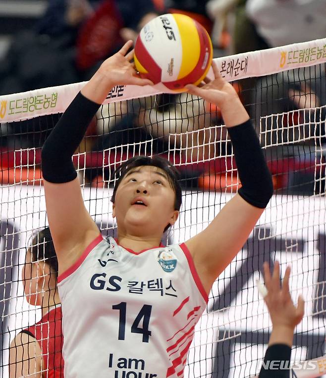 [광주=뉴시스] 류형근 기자 = 8일 오후 광주 서구 페퍼스타디움(염주종합체육관)에서 열린 2021~2022 V-리그 AI페퍼스 대 GS칼텍스의 경기, GS칼텍스 김지원이 토스 훈련을 하고 있다. 2021.12.08. hgryu77@newsis.com
