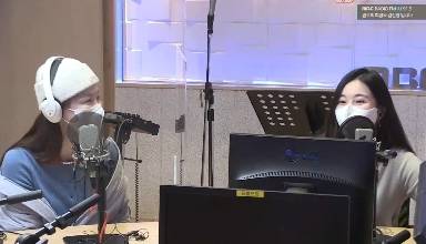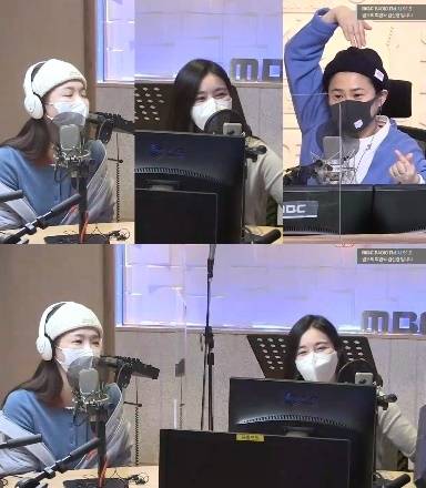 이해리는 "거짓말 하지 마라. 고막검사 한다"고 엄포를 놓았으나 강민경은 정말이라며 "콘텐츠 기획 중이다. 오른쪽이 현저하게 안 들린다. 영향이 있는 거 같다. 가창력이 출중한 분이라 평소 말할 때도 두성을 써 쭉쭉 꽂힌다"고 주장해 웃음을 줬다. (사진=MBC FM4U '정오의 희망곡 김신영입니다' 캡처)