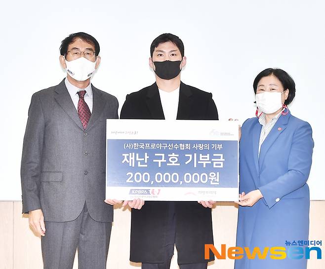 12월 9일 오후 한국프로야구선수협회(회장 양의지)가 희망브리지에 사회공헌사업 1억원, 코로나19 방역 1억원 등 총 2억원을 기부하는 행사가 서울 마포구 희망브리지 전국재해구호협회에서 열렸다.