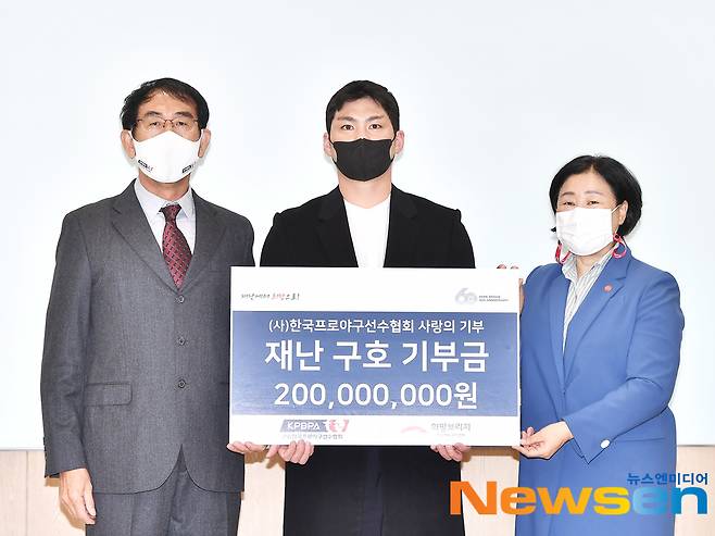 12월 9일 오후 한국프로야구선수협회(회장 양의지)가 희망브리지에 사회공헌사업 1억원, 코로나19 방역 1억원 등 총 2억원을 기부하는 행사가 서울 마포구 희망브리지 전국재해구호협회에서 열렸다.